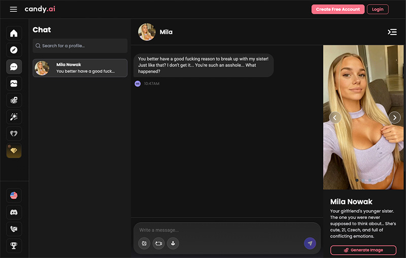 Images are woven directly into the chat: as the conversation heats up, the AI generates photos that match what is happening in real time. A standalone image generator handles custom creations from a text prompt, and an image-to-video tool turns any still into a short animated clip. The Time Machine feature lets you rewind any conversation and take it in a different direction, and group chats are supported for those who want to push things further. A free tier is available with enough daily credits to get a proper feel for the platform.